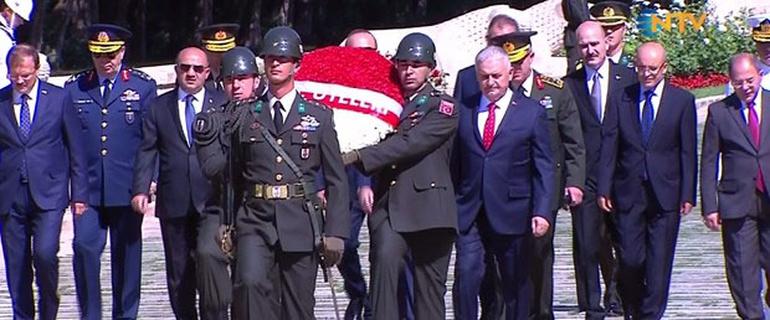 YAŞ heyeti daha sonra üzerinde “YAŞ üyeleri” yazan çelenkle Aslanlı Yol’dan yürüdü. Başbakan Yıldırım’ın, Atatürk’ün mozolesine çelenk bırakmasının ardından, saygı duruşunda bulunuldu. Yıldırım, saygı duruşunun ardından dua etti.