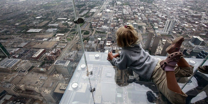 Anna Kane, 5, of Alton, Ill. looks down from "The Ledge," the new glass balconies suspended 1,353 feet (412 meters) in the air and jut out 4 feet (1.22 meters) from the Sears Tower's 103rd floor Skydeck Wednesday, July 1, 2009 in Chicago. The Ledge will open to public on Thursday. (AP Photo/Kiichiro Sato)