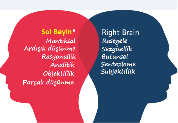 İnsan beyninin sağ ve sol hemisfer olmak üzere iki ayrı bölgesi vardır. Beynin sağ ve sol kısımları farklı zihinsel süreçleri yönetir. Sağ eli kontrol eden beynin sol kısmı; konuşma, dil, yazı yazma, mantık, matematik ve bilim konularından sorumludur. Sol eli kontrol eden beynin sağ kısmı ise; müzik, sanat, algı ve duygulardan sorumludur. Sağ kısım soyut düşünüp büyük resmi görme kapasitesi sağlarken, sol kısım daha spesifik özellikleri ayırt etme üzerinden gider.