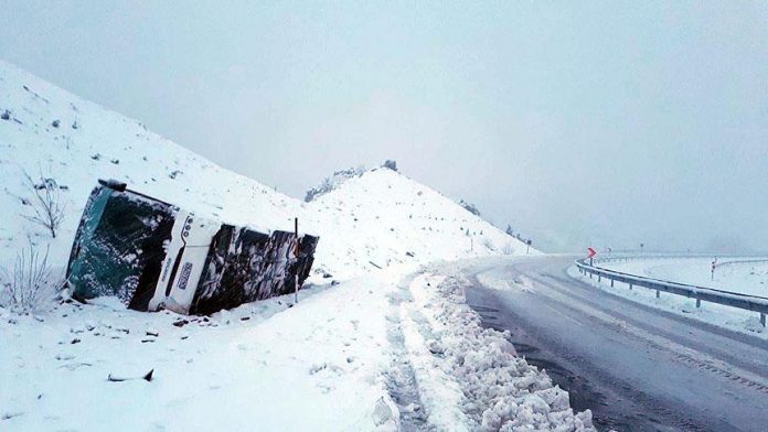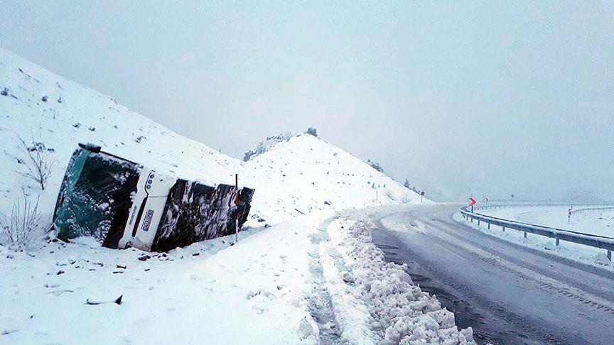 Alınan bilgiye göre, bir yakınlarının Ağrı’daki cenazesine katılmak üzere İstanbul’dan yola çıkanları taşıyan Özdemir İsmiçoğlu (49) yönetimindeki 34 UU 4782 plakalı otobüs, D-100 karayolunun Koyulhisar ilçesi Yemişli mevkisinde kar yağışı ve buzlanma nedeniyle kontrolden çıkarak devrildi.