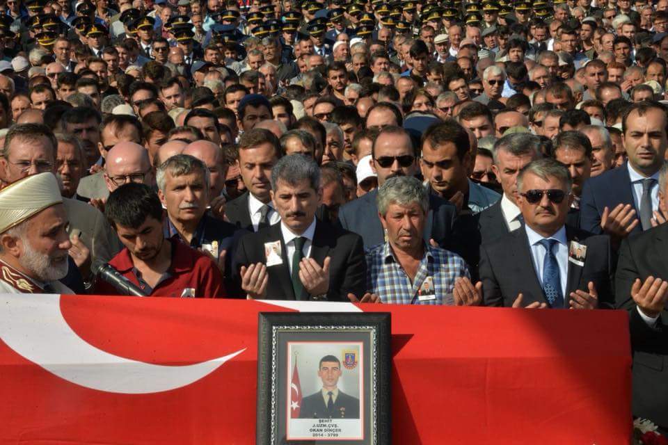 Cuma vakti İl Müftüsü Şahin Yıldırım’ın kıldırdığı cenaze namazının ardından Soylu ile Erdoğan ve diğer protokol üyeleri, şehidin tabutunu cenaze aracına kadar taşıdı. Bu sırada bir vatandaş Bakan Soylu’ya ”Vatan hainleri için idam istiyoruz.” diye seslendi.