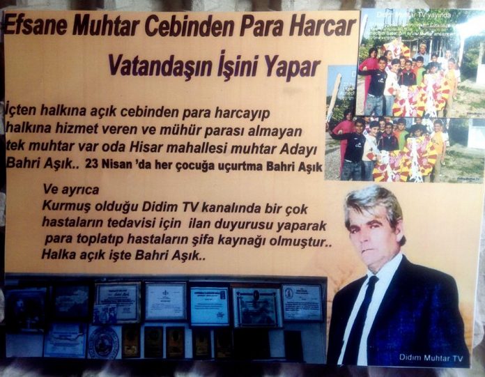 Hisar Mahallesi’nde 35 yıldır muhtarlık koltuğunu kimseye kaptırmayan Bahri Aşık, eski radyo tamirciliğinin yanında 23 yıldır çeşitli basın kuruluşlarında sürdürdüğü muhabirlik göreviyle de dikkati çekiyor.