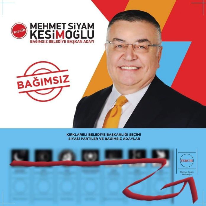 Kırklareli’nde 31 Mart’ta yapılan yerel seçimlerde resmi olmayan sonuçlara göre mevcut belediye başkanı ve bağımsız başkan adayı Mehmet Siyam Kesimoğlu, 17 bin 176, Cumhur İttifakı’nın adayı MHP’li Derya Bulut 16 bin 928 oy aldı.