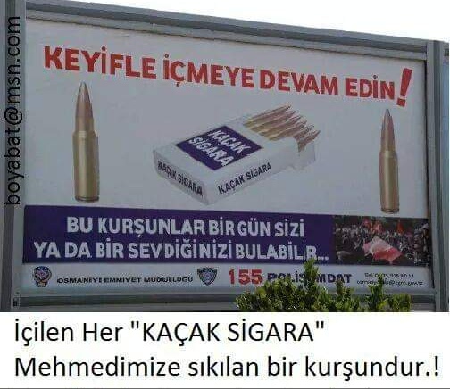 Sigara daki aşırı vergi yükü Amerika nın 1930 lar daki içki yasağı benzeri kaçak içki gibi kara para kolay para kuralı şeklinde iştahları kabartıyor. Yalnız perde gerisinde pkk terör örgütünün olduğunu bildiğinizde insan tüketici olarak da bu tarz ürünlere yönelirken iki defa düşünmeli hem zehir bedeninize zarar veriyor hem de verdiğiniz her lira Mehmetçiğe kurşun olarak geliyor..