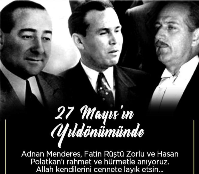 Cumhuriyet tarihinde seçimle iş başına gelmiş bir hükümetin, köpek /bebek gibi eften püften davalarla başlayıp, anayasal düzeni değiştirmeye varan suçlamalarla ilk darbenin yapıldığı kara bir yaprak olarak tarihde ki yerini aldı.. idam cezasına çarptırılan apar topar, rutin dışı saatlerde infaz edilen, Basbakan Adnan Menderes, Dış işleri Bakanı Fatin Rüştü Zorlu Maliye Bakanı Hasan Polatkan anıldı. Askeri kast sistrminin vesayet MAKAMINA dönüştüğü tarihde olan 27.Mayıs 1960 tarihi yıllarca demokrasi bayramı diyerek de millete kutlatıldı.. Askeri muhtıra ların önü, mektuplu talimatlarla milli iradeye şekil verme uslupları ve ABD ye sadakat gösterilerinin naslangıcı olarak da bu tarih önem arz eder..