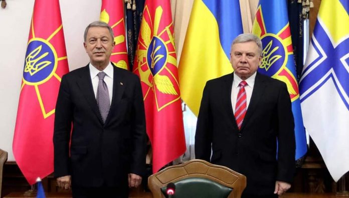 Ukrayna Savunma Bakanı Andriy Taran, Dışişleri Bakanı Mevlüt Çavuşoğlu, Milli Savunma Bakanı Hulusi Akar, Ukrayna Dışişleri Bakanı Dmitro Kuleba’nın katılımıyla, Ukrayna Dışişleri Bakanlığında düzenlenen “2+2” formatındaki toplantıda konuştu.