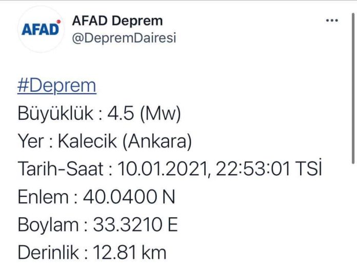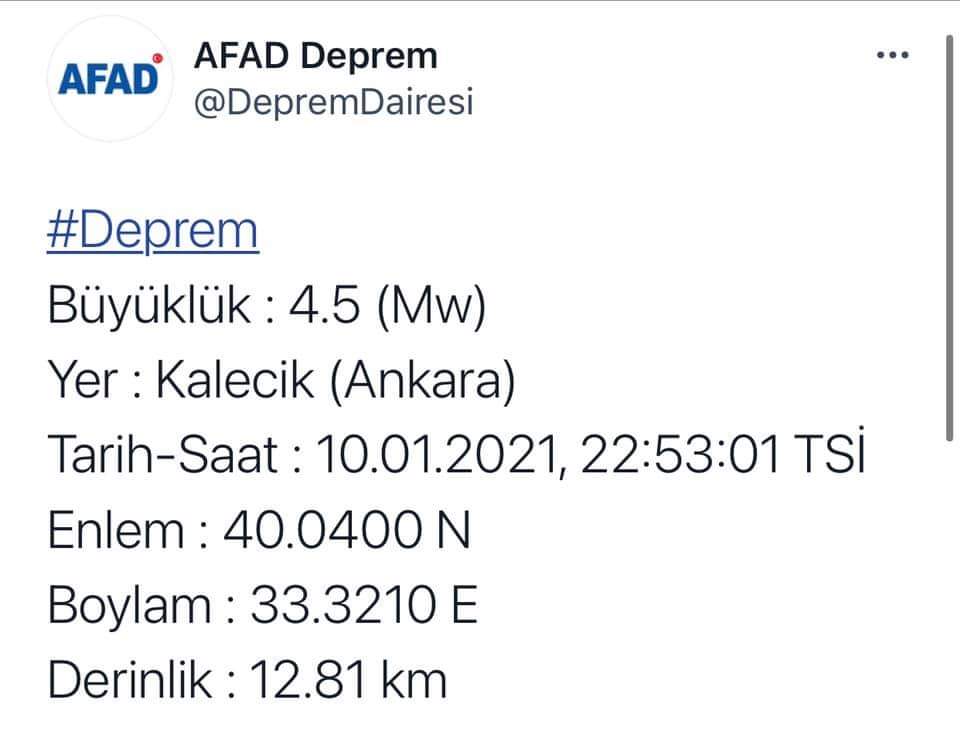 Afet ve Acil Durum Yönetimi Başkanlığı (AFAD), saat 22.53’teAnlara nın kalecik ilçesin de 4.5 büyüklüğünde deprem meydana geldiğini açıkladı.