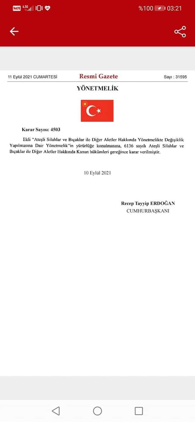 09.2021 Tarihli Resmi Gazetede yayımlanan 4305 sayılı Cumhurbaşkanı Kararı ile, 6136 sayılı kanuna ilişkin yönetmeliğin 4.maddesi M bendi uyarınca infaz koruma başmemuru ve memurları silah taşıma ruhsatı hakkına yeniden sahip olmuştur.