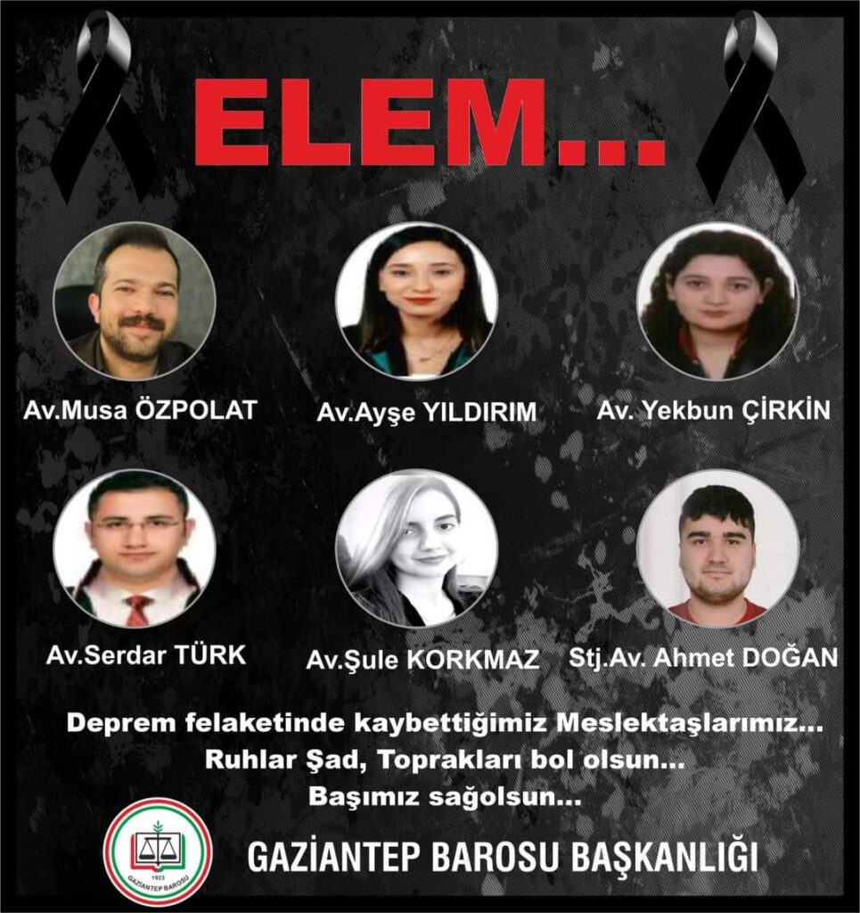 Gaziantep Barosu na kayıtlı avukatlık yapan depremde kaybettiğimiz arkadaşlarımıza rahmet ailelerine sabırlık diliyoruz