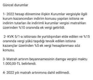 Kurumlar vergisinde %10 yeni vergi geldi böylelikle %23 olan kurumlar vergisi oranı %33’e çıktı. Bu oran yararlanılan istisna tutarlarına göre %40-50’lere çıkabilir