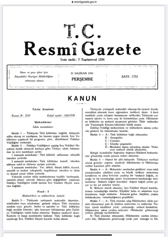 Türk Soylu olmayanlar istediği yere yerleşemez. Anadili Türkçe olmayanlar müstakil mahalle kuramaz, işçi ve sanatçı kümesi oluşturamaz. Ecnebilerin bir Belediye’deki nüfusu %10’u geçemez.